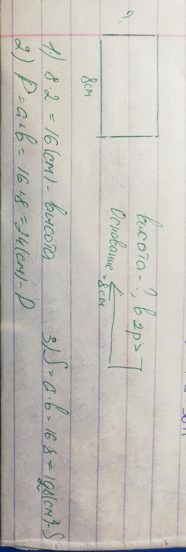 Основание прямоугольника равно 8 см, высота в два раза больше основания. Определите периметр и площадь. Помогите пж