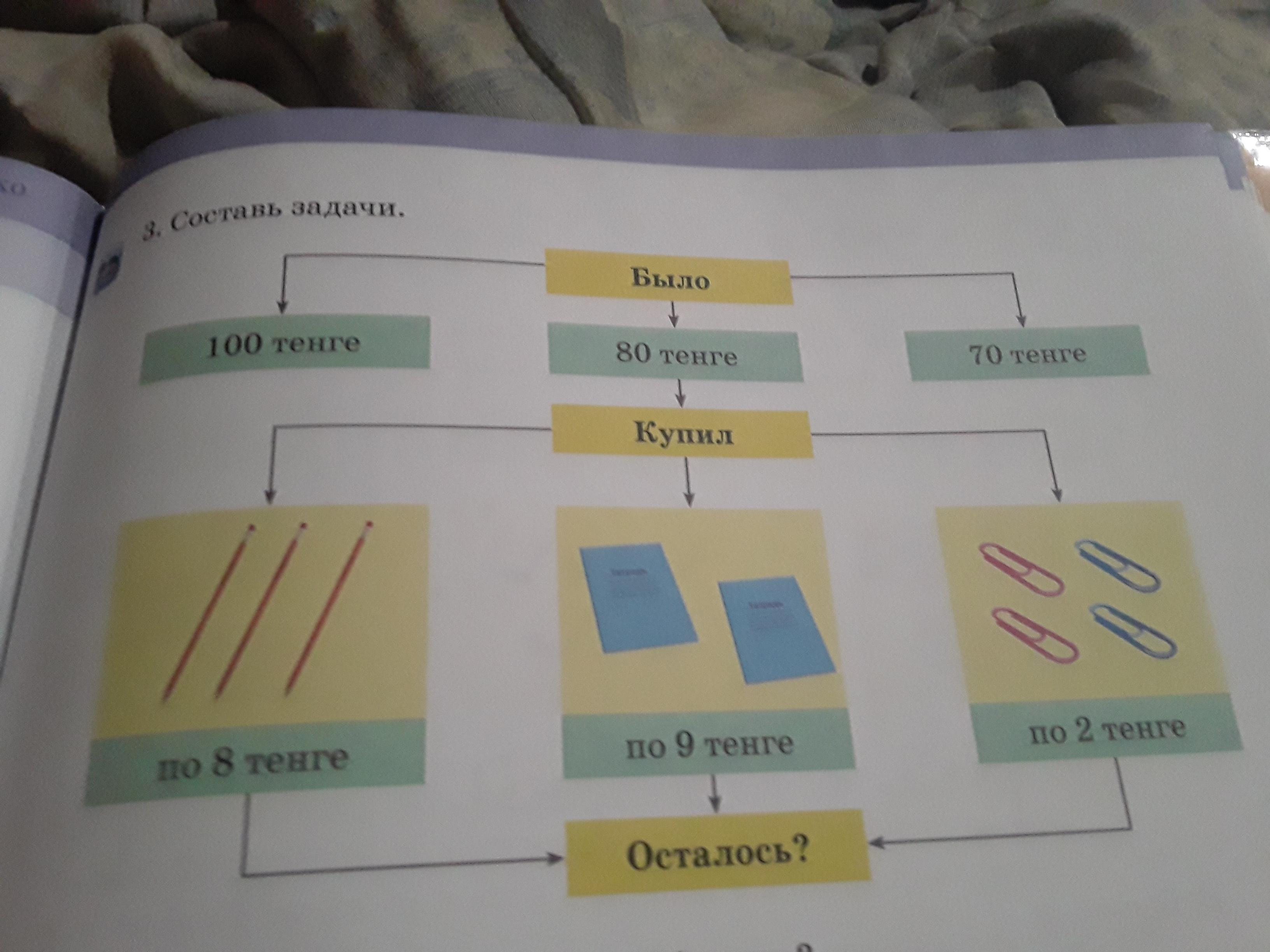 3. У Васи было 100 тенге. В магазине ему нужно купить: 8 тетрадей, 4 карандаша и 5 скрепок. Хватит ли Васи денег, для того чтобы купить всё необходимое для учёбы?