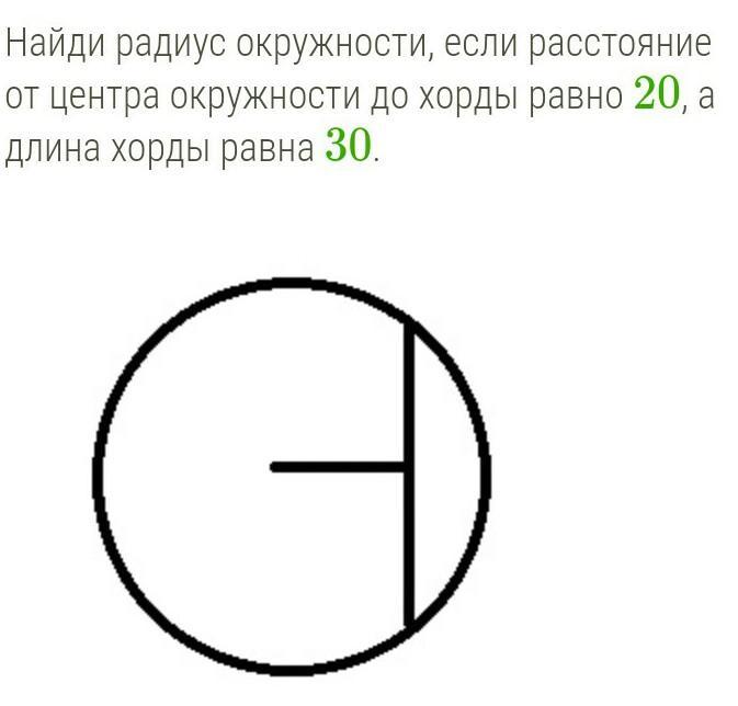 Найти радиус окружности, если расстояние от центра окружности до хорды равно 20, а длина хорды равна 30.