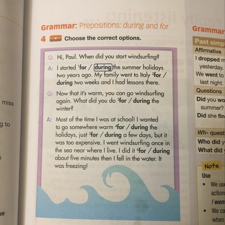 A: Most of the time I was at school! I wanted to go somewhere warm for/during the holidays, just for/during a few days, but it was too expensive. I went windsurfing once in the sea near where I live. I did it for/during about five minutes then I fell in the water. It was freezing!