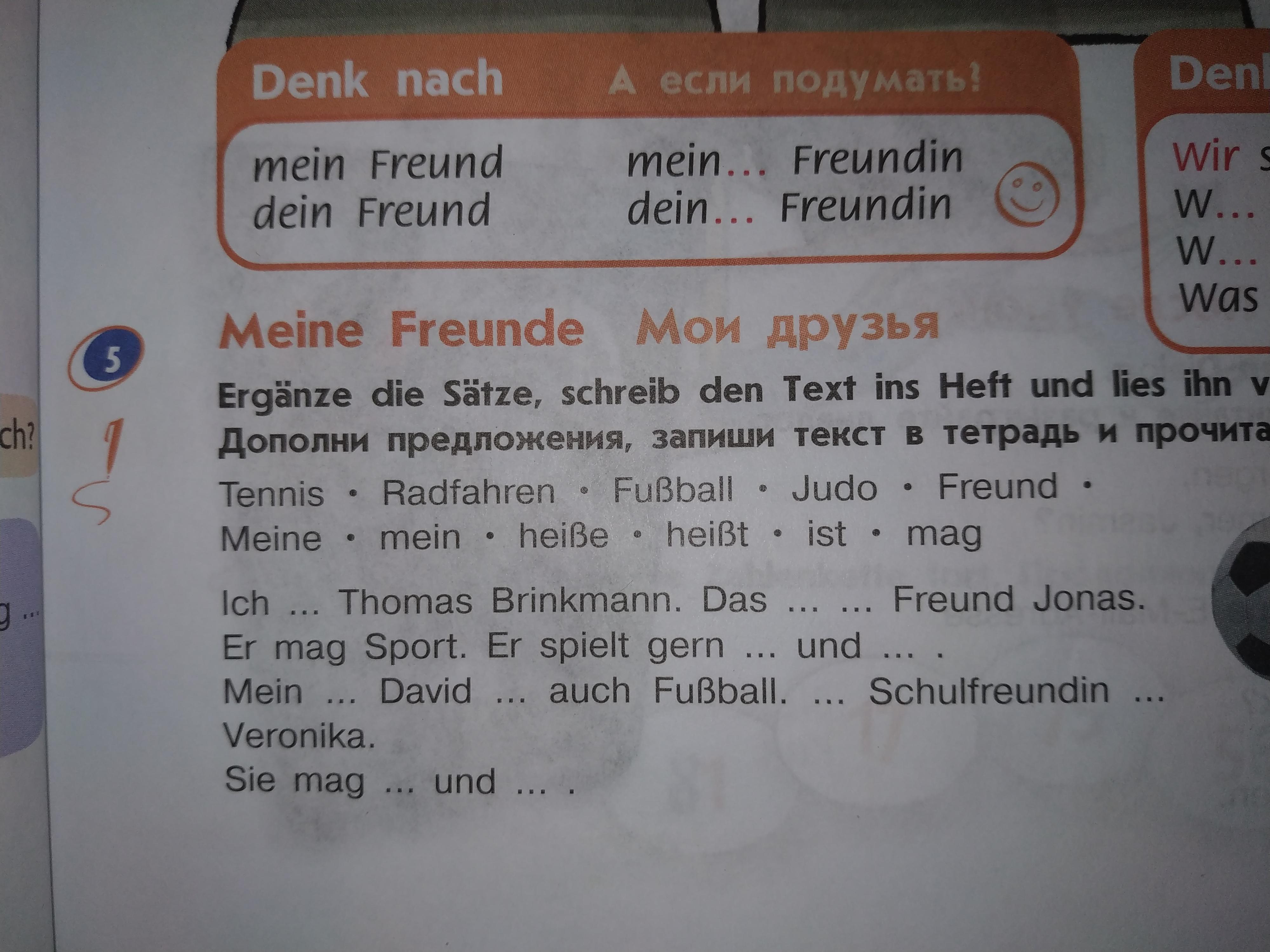Ich heiße Thomas Brinkmann. Das ist mein Freund Jonas. Er mag Sport. Er spuelt gern Fußball und Tennis. Mein Freund David mag auch Fußball. Meine Schuifreundin heißt Veronika. Sie mag Radfahren und Judo.