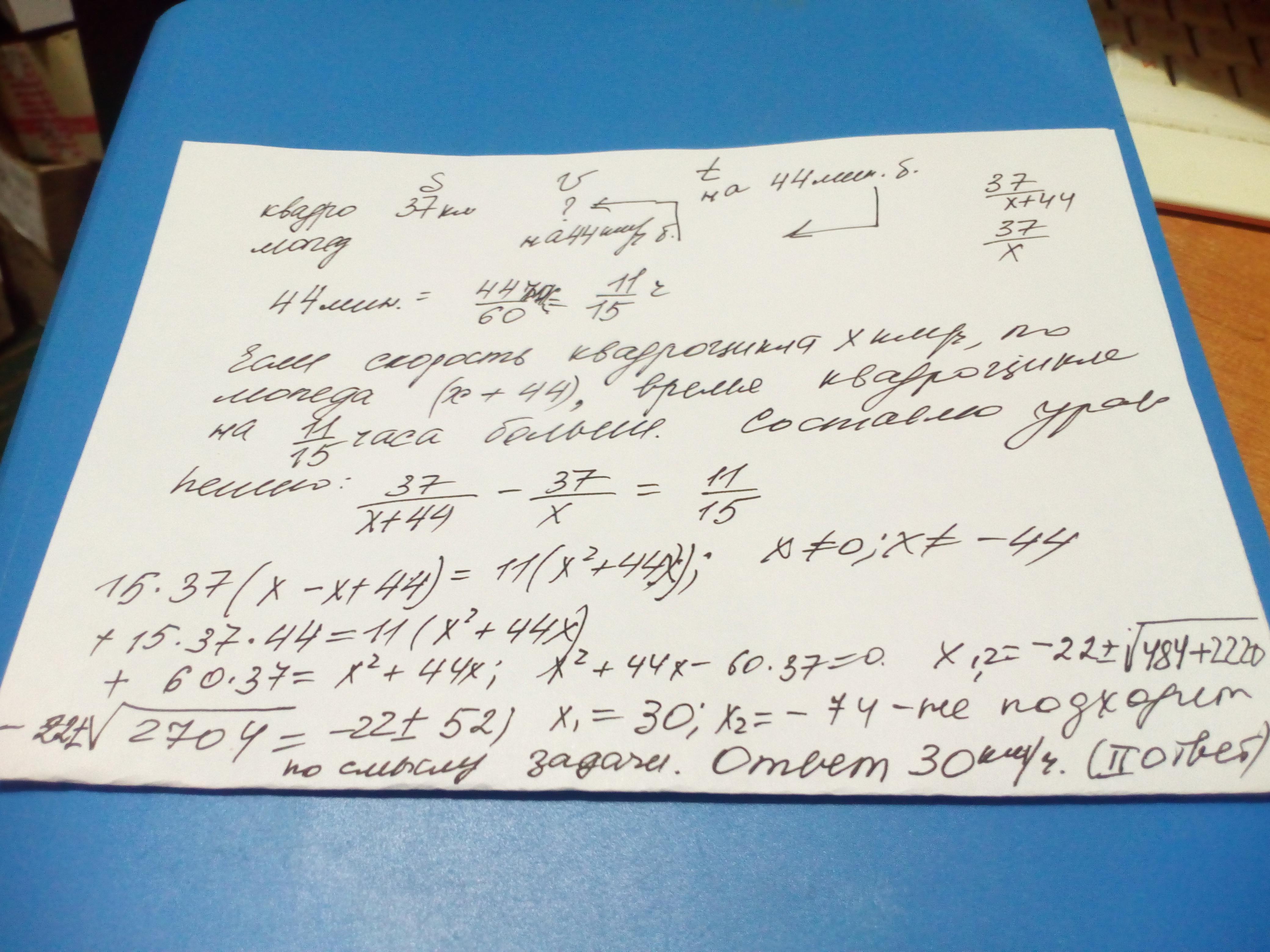 Пусть скорость квадроцикла х км/час, тогда скорость мопеда х+44 км/час. Квадроцикл был в пути на 44 мин=11/15 часа больше. Составим уравнение: