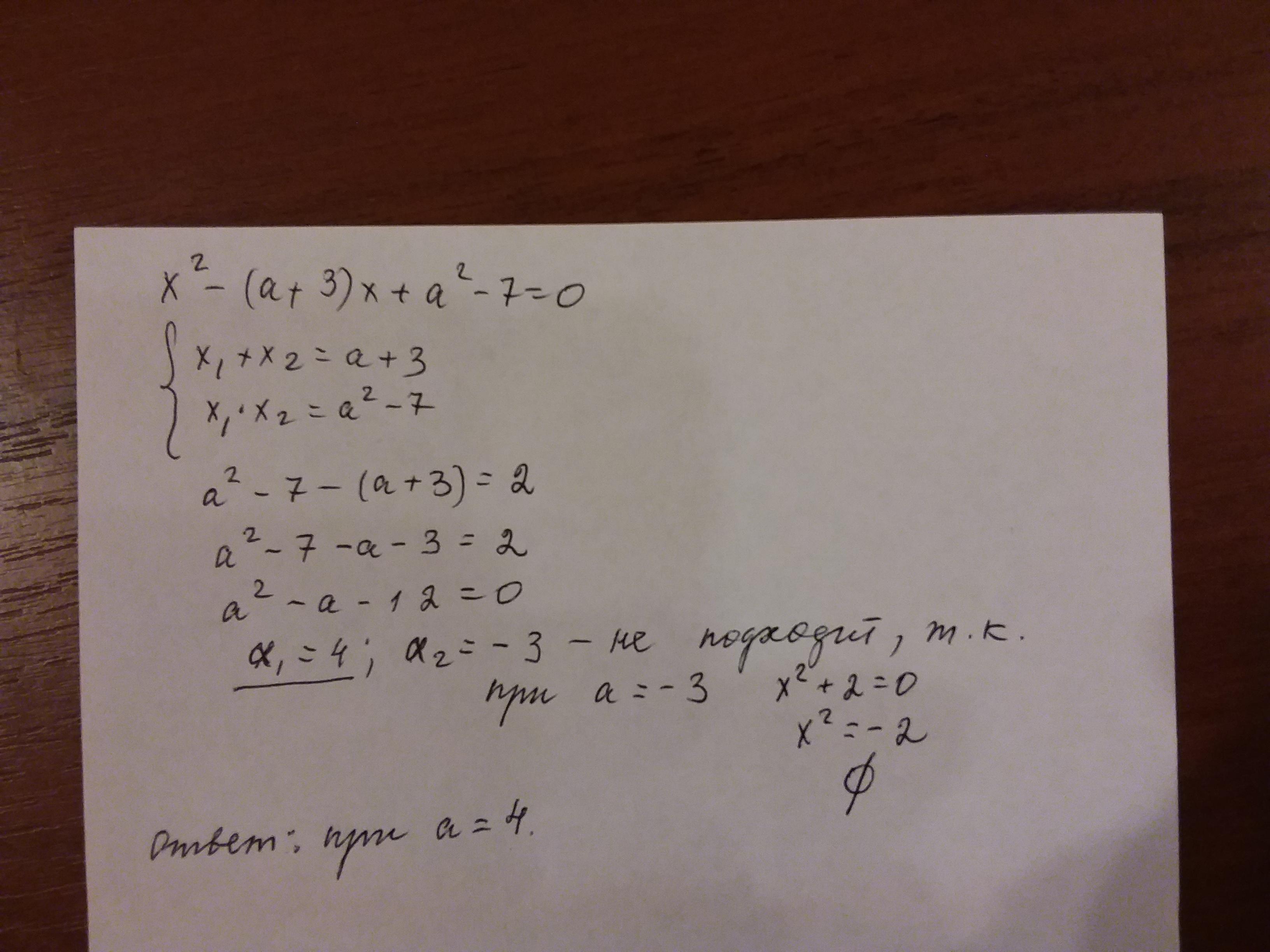 При каких значениях параметра a произведение корней уравнения x^2−(a+3)x+a^2−7=0 на 2 больше суммы корней?