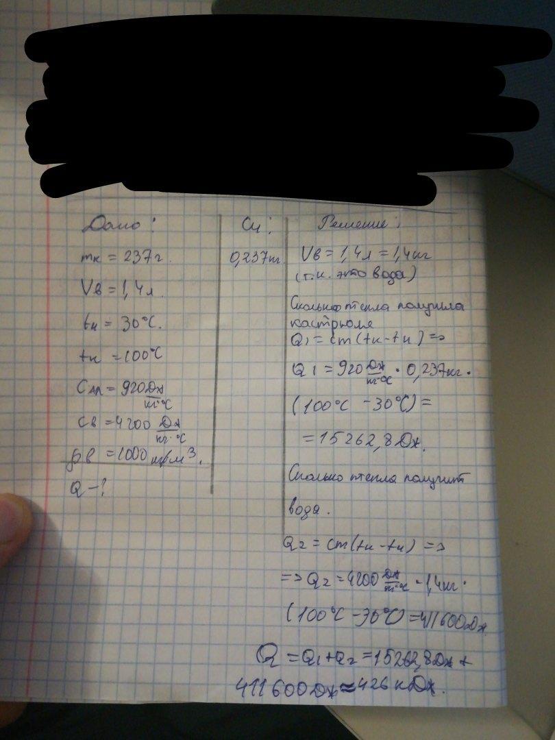 Определи, какое количество теплоты получили алюминиевая кастрюля массой 237 г и находящаяся в ней вода объёмом 1,4 л при нагревании от 30°C до кипения при температуре 100°C. Удельная теплоёмкость алюминия равна 920 Дж/(кг·°C), удельная теплоёмкость воды — 4200 Дж/(кг·°C), плотность воды — 1000 кг/м³.