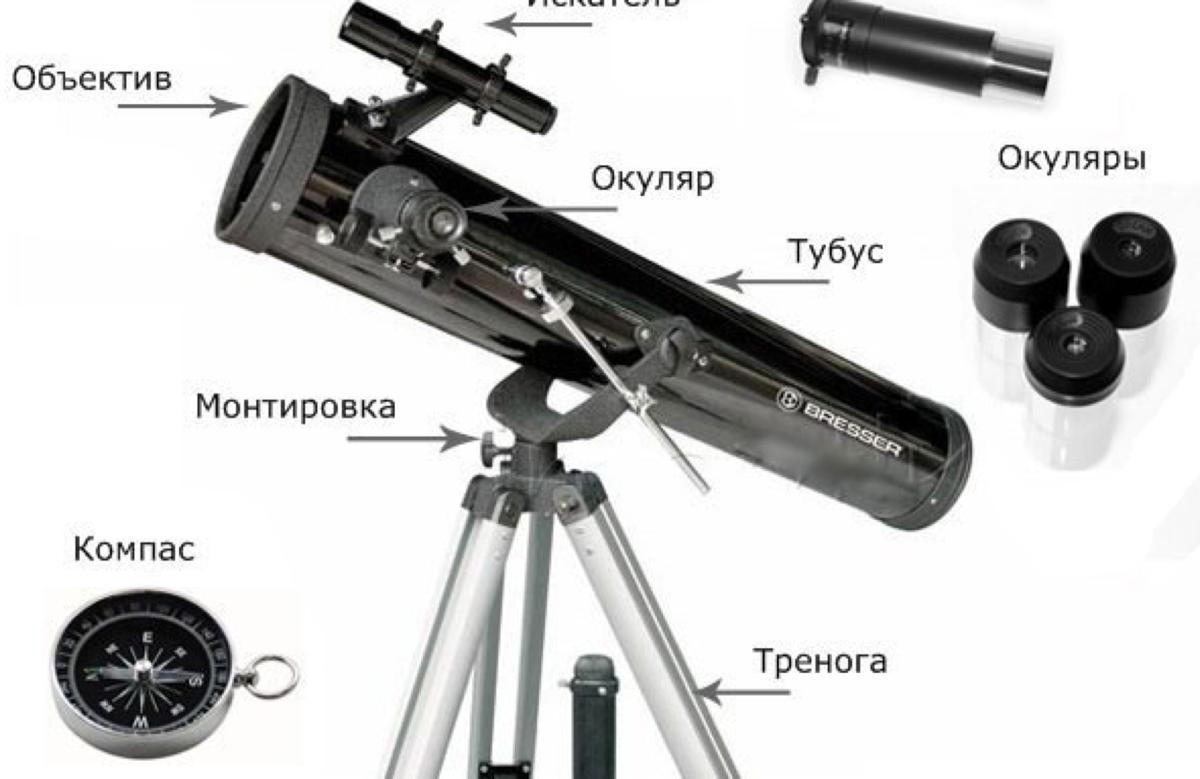 . Телескоп-рефрактор состоит из объектива, окуляра, штатива и металической трубы. Объектив и окуляр это 2 линзы, которые изменяют ход лучей попадающих в телескоп. Объектив фокусирует звездный свет в одной точке, а окуляр рассеивает этот сфокусированный свет делая его видимым для человеческого глаза.