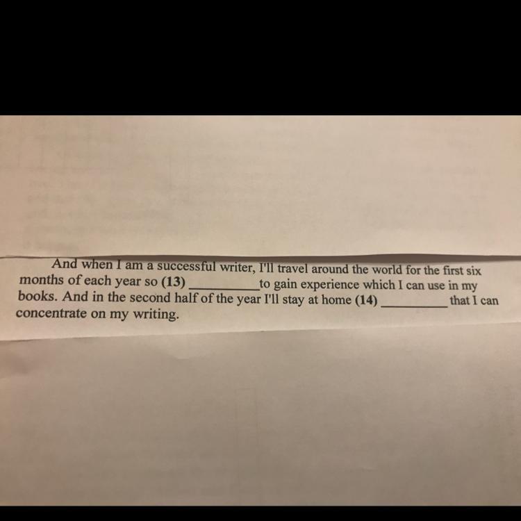 And when I am a successful writer, I’ll travel around the world for the first six months of each year so I 13. will be able to gain experience which I can use in my books. And in the second half of the year I’ll stay at home 14. so that I can concentrate on my writing.