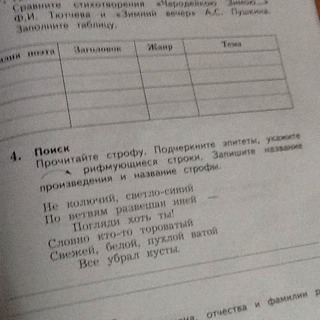Упр. 4. Рифмующиеся строки: синий-иней, ты-кусты, тороватый-ватой.