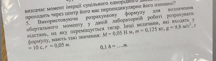 Используя расчетную формулу для определения крутящего момента в данной лабораторной работе рассчитать расстояние, на которое перемещается груз. Другие величины, входящие в формулу, имеют следующие значения: M = 0,05; m = 0,125кг; g = 9,8м / с2; t = 10 с; r = 0,05м