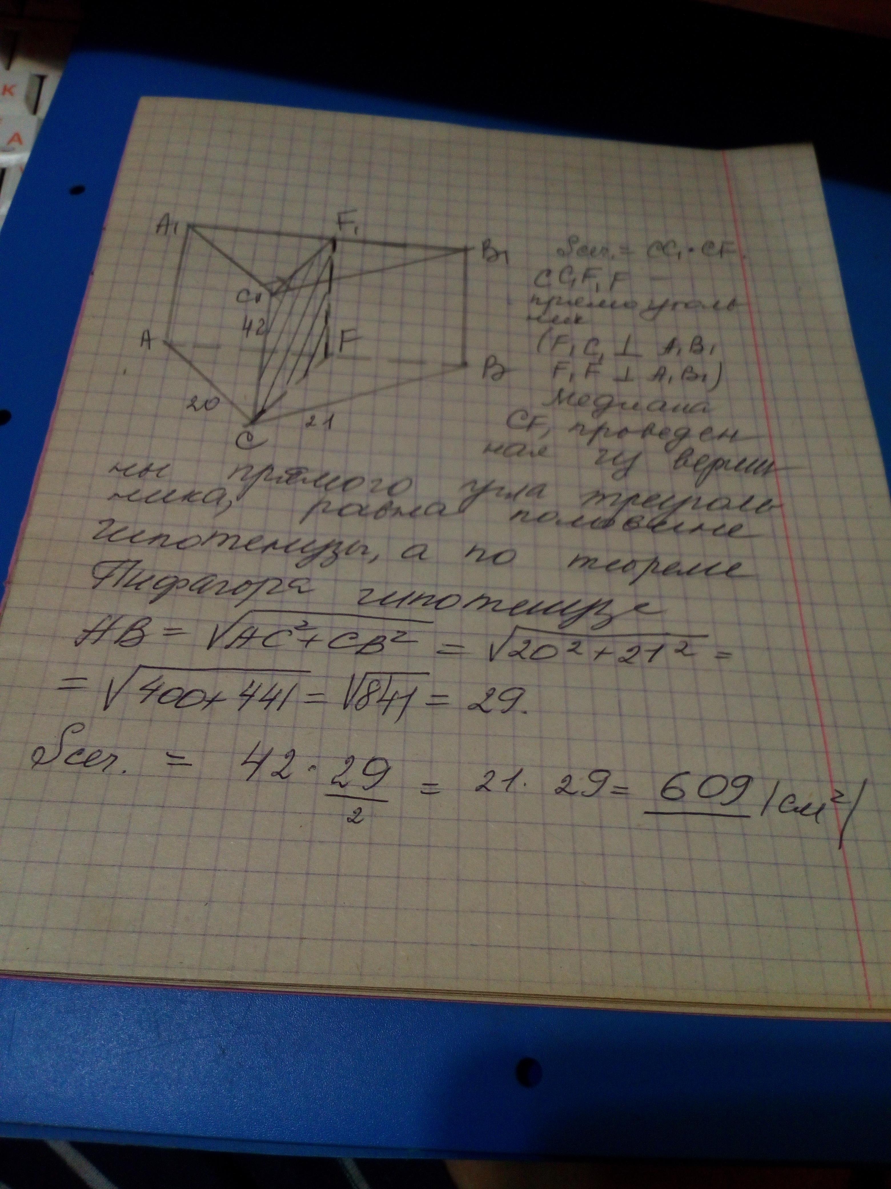 Основою прямої призми є прямокутний трикутник катети якого дорівнюють 20 см і 21 см через середину гіпотенузи перпендикулярно до неї проведено площину. знайдіть площу перерізу, якщо бічне ребро призми дорівнює 42 см.