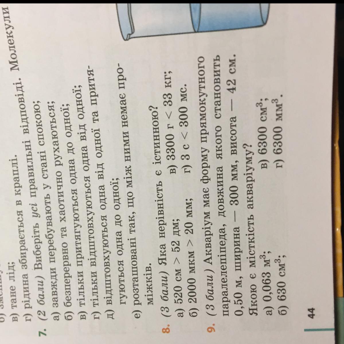 9) а = 0,50 м, b = 300 мм = 0,3 м, с = 42 см = 0,42 м. Місткість акваріума (об'єм прямокутного паралелепіпеда): У= аЬс = 0,5 м • 0,3 м * 0,42 м = 0,063 м3 Відповідь: а.