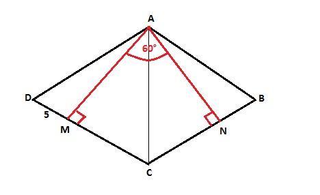 Прямоугольные треугольники DAM и BAN равны по гипотенузе и острому углу (гипотенузы DA и АВ - стороны ромба, ∠D = ∠B как противоположные углы ромба). Следовательно, ∠DAM = ∠BAN, а так как диагональ АС ромба делит ∠DAB пополам (свойство), то ∠MAC = <NAC = 30°. Тогда в прямоугольных треугольниках MAC и NAC ∠АСМ = ∠ACN = 60° (по сумме острых углов прямоугольного треугольника). Тогда угол ∠С ромба равен 120°, а ∠D = 60° (по сумме углов ромба, прилегающих к одной стороне).