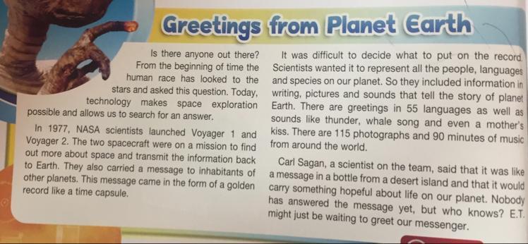 Трудно было решить, что поставить на учет. С незапамятных времен ученые хотели его представлять весь народ, язык человеческой расы посмотрел и видов на НАШЕЙ ПЛАНЕТЕ. Поэтому они включили в звезды и задал этот вопрос. Сегодня, письма, фотографии и звуки, которые рассказывают о технологии планета космос Земля. Есть приветствия на 55 языках, а также возможно и позволяет нам искать ответ. звучит как гром, песни китов и даже мать в 1977 году ученые NASA запустила "Вояджер-1" и поцелуй. Есть 115 фотографий и 90 минут музыки Вояджер-2. Два космических аппарата были на миссии, чтобы найти со всего мира. более подробную информацию о пространстве и передавать информацию обратно Карл Саган, ученый в команде, сказал, что это было похоже на Землю. Они также несли послания к жителям послание в бутылке с необитаемого острова, и что он будет на других планетах. Это сообщение пришло в виде золотого нести что-нибудь обнадеживающее о жизни на НАШЕЙ ПЛАНЕТЕ. Никто не Запись, Как капсулу времени. ответил на это сообщение, но кто знает? Т. е. может быть просто ждет, чтобы приветствовать нашего посланника.