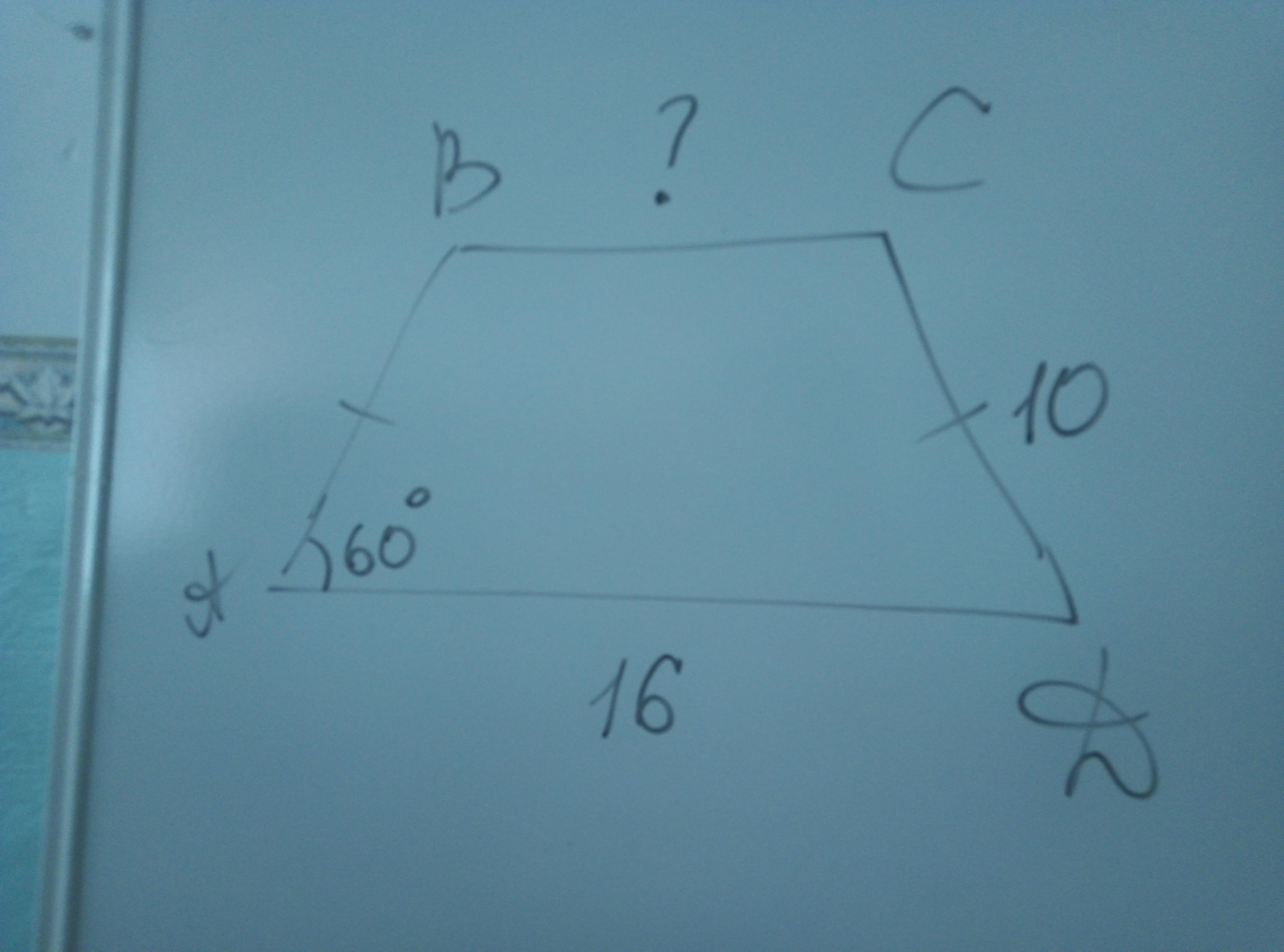 Дано: АВСD - трапеция, АВ=СD=10 см, АD=16 см, ∠А=60°. Найти ВС.