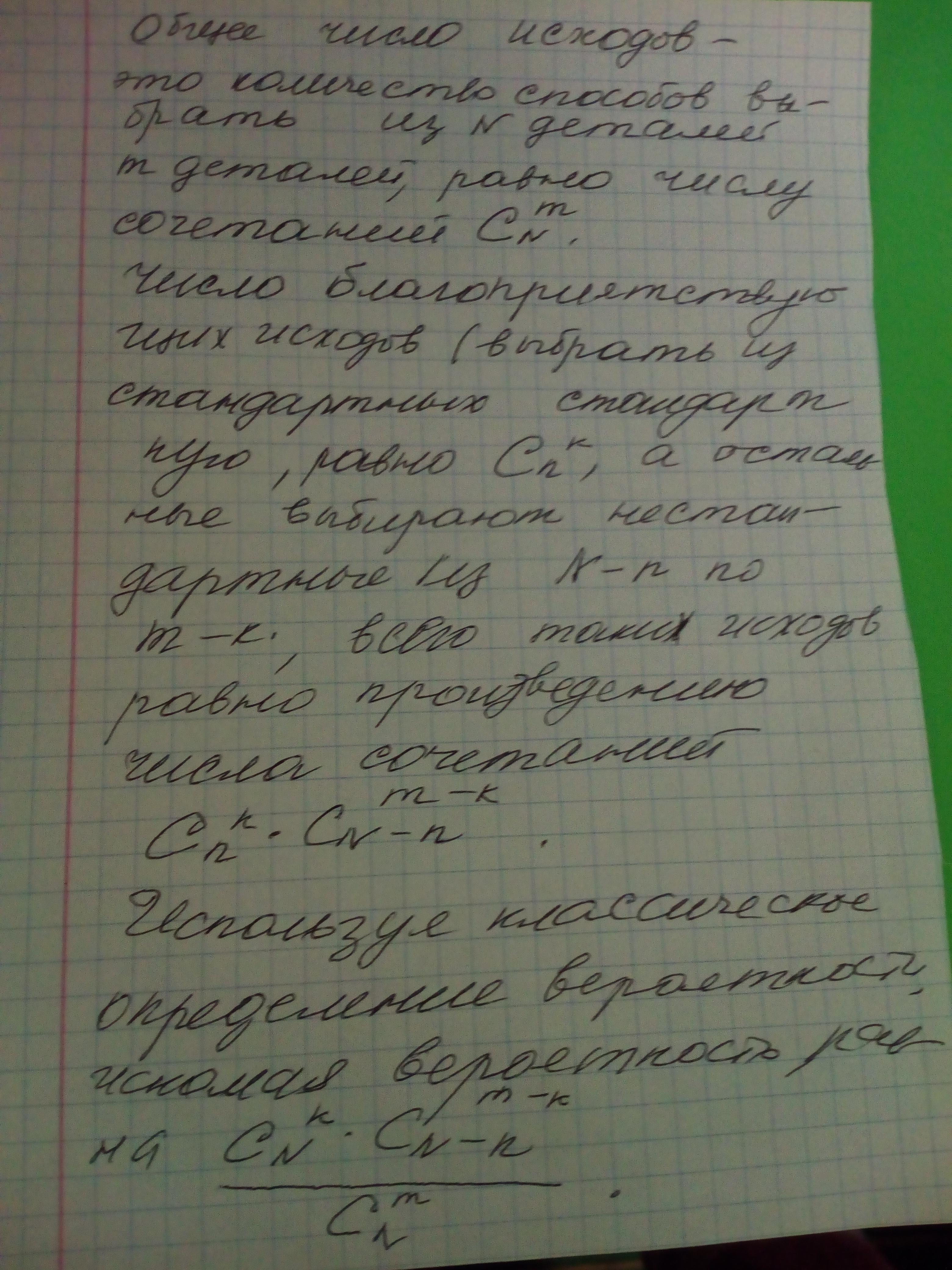 (выбираем сколькими способами можно взять k стандартных деталей из n и не стандартных (m-k) деталей из (N-n) ).