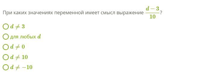 Дробь не имеет смысла тогда, когда у нее в знаменателе стоит ноль (на ноль делить нельзя!). Но в данном случае в знаменателе стоит 10, а не 0 (а также нет таких функций, как корни, логарифмы, тригонометрические функции, у которых также есть свои "ограничения"). Поэтому выражение имеет смысл при 2) любых d .