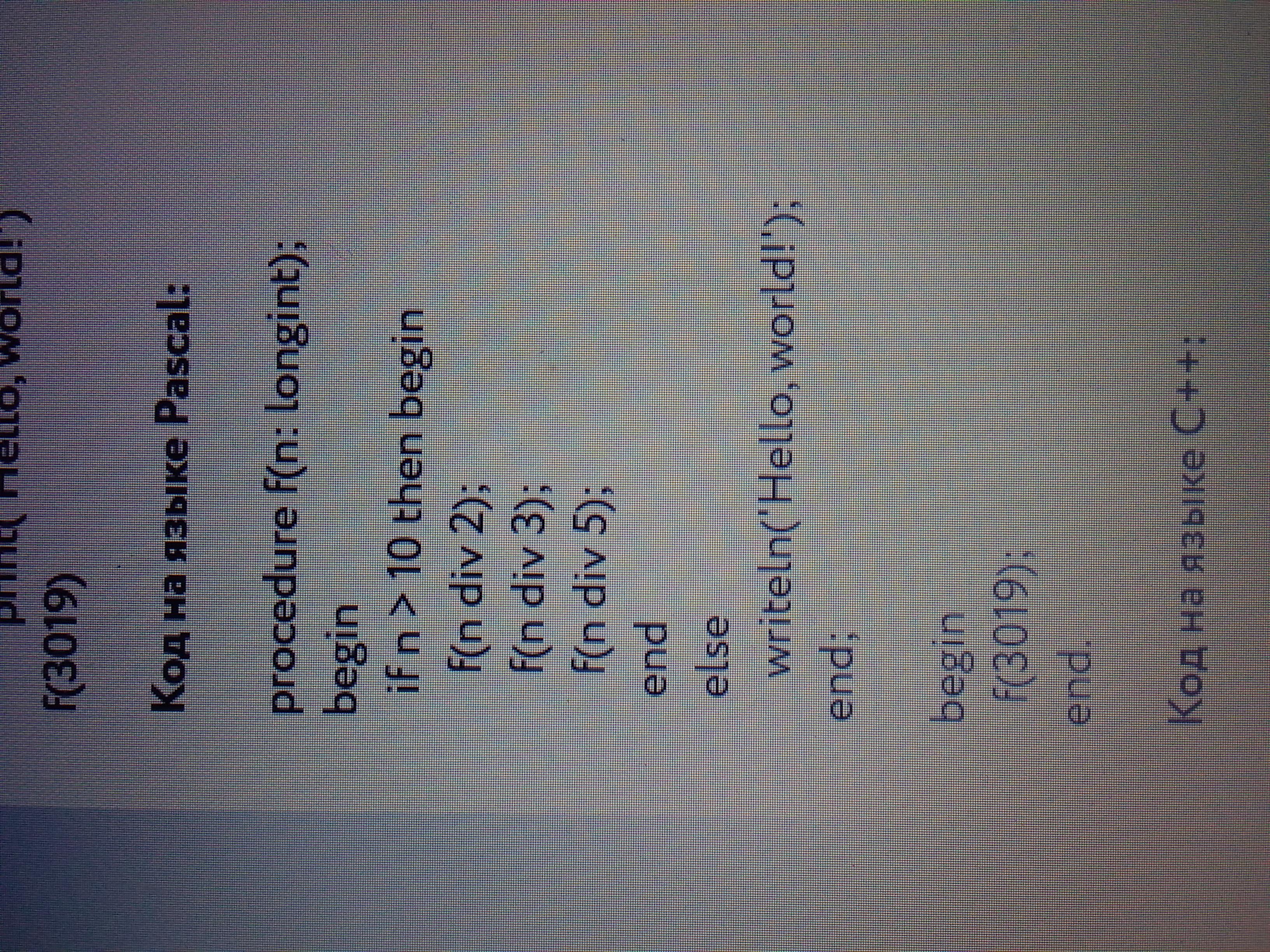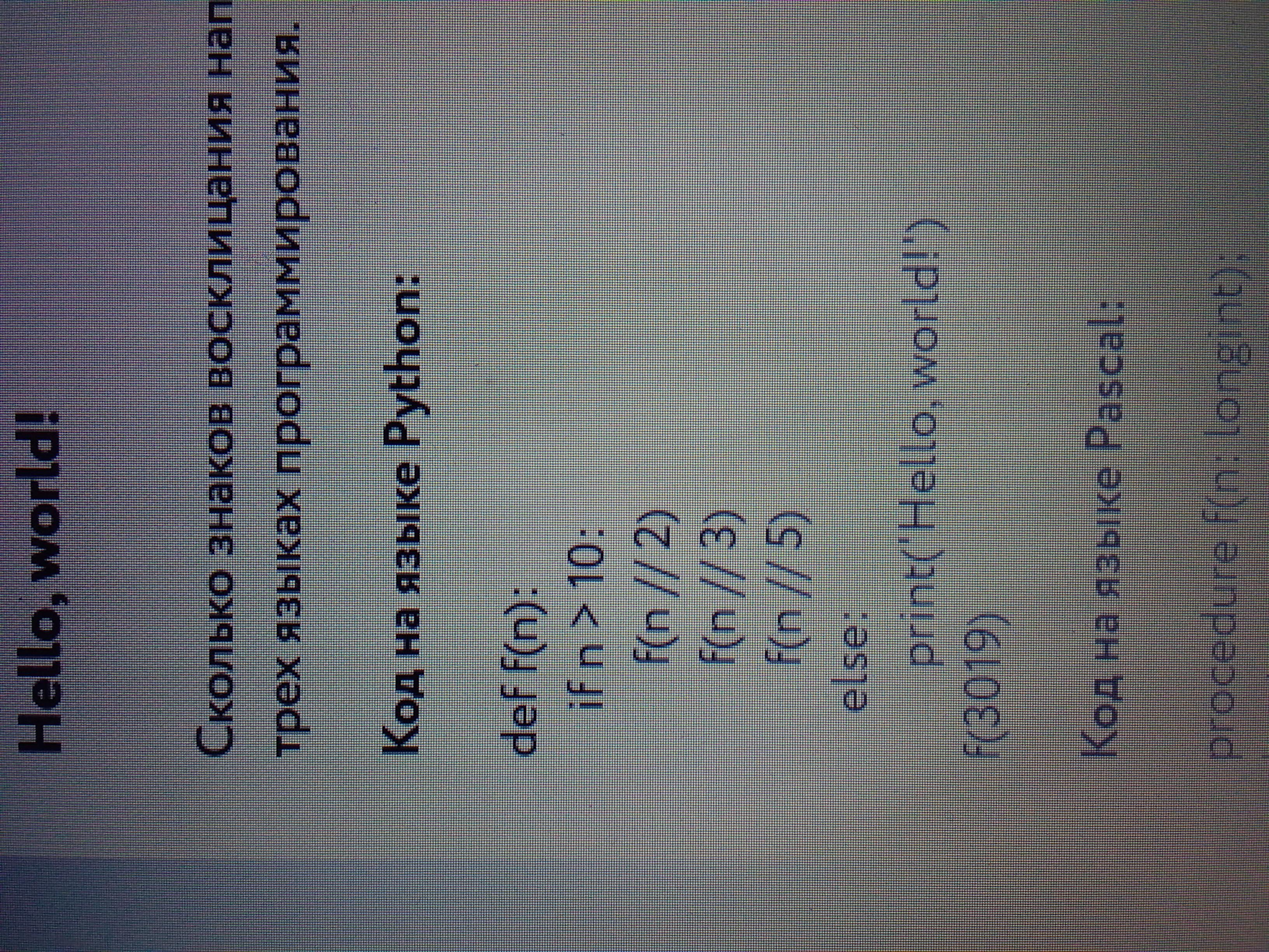Сколько знаков восклицания напечатает такая программа?Для удобства код приведен в 3 языках программирования