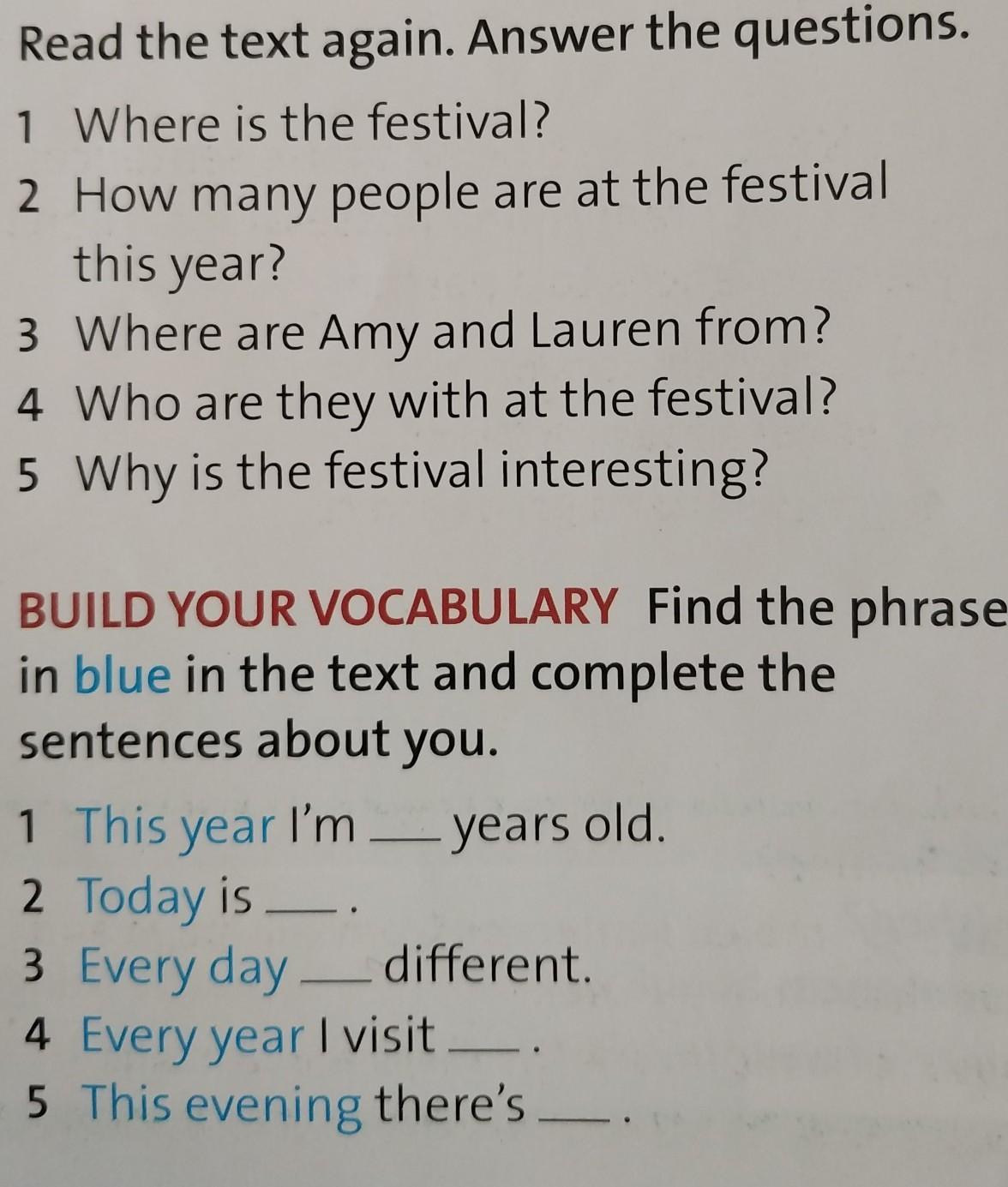 С фестивалем вопросы к тексту, не могу сказать ответ. В Build Your Vocabulary пиши о себе, 1.Этого года мне .. лет. 2.Сегодня (наверно напиши сегодняшний день). 3. не знаю. 4. Каждый год я посещаю ... . 5.Этого вечера будет ..