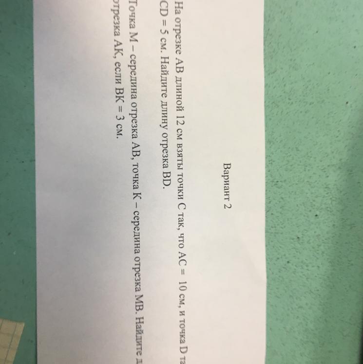 Ответ: ВD = АВ - АС + СD = 12cм - 10 см + 5 см = 7 см.