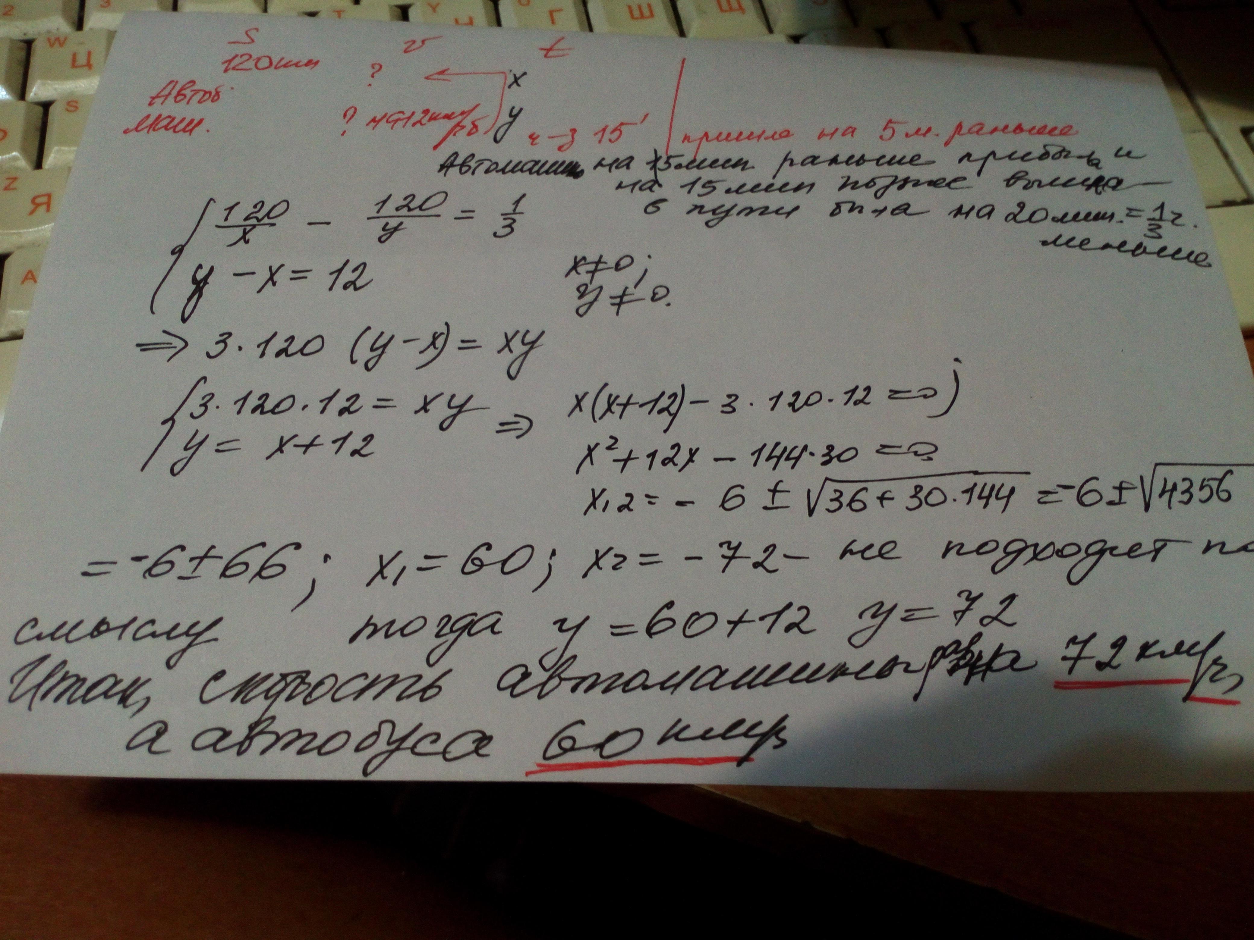 Расстоние между городами A и B равно 120 км. Из города A в город B вышел автобус, а через 15 минут- легковая машина, скорость которой больше скорости автобуса на 12 км/ч. Легковая машина пришлав город B на 5 минут раньше, чем туда прибыл автобус. Найдите скорости автобуса и легковой машины.