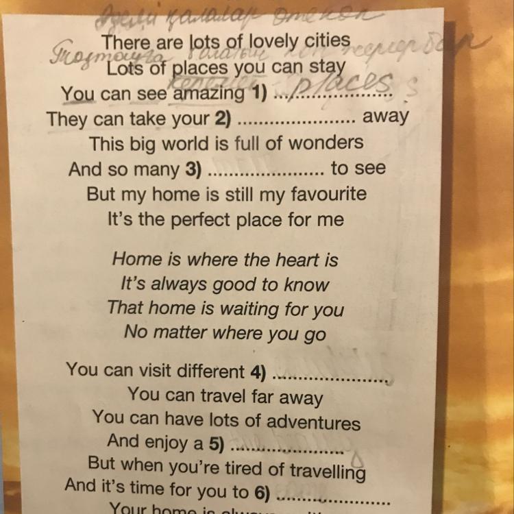 1) buildings 2) breath 3) sights 4) places 5) holiday 6) rest