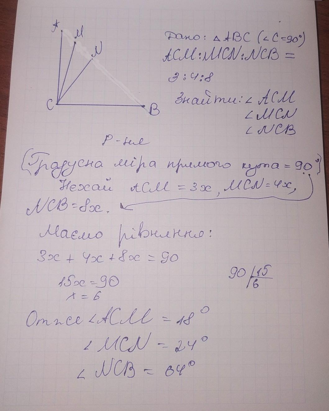 А сумма 3х+4х+8х=90, откуда 15х=90; х=6, значит величины углов 6*3=18; 6°*4=24°; 6°*8=48°