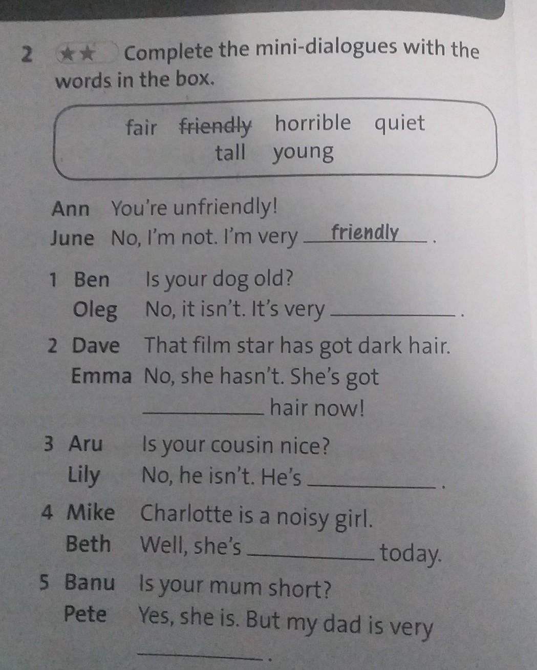 1. young, 2.fair, 3.horrible, 4. quiet, 5.tall