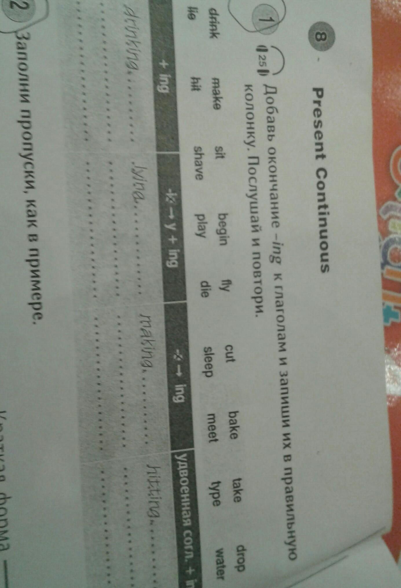добавь окончание -ing к глаголам и запиши их в правильную колонку. послушай и повтори помогите