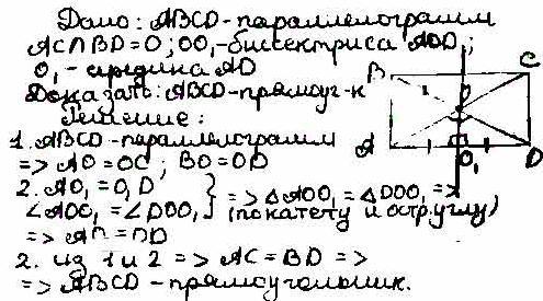 Диагонали параллелограмма ABCD пересекаются в точке O. биссектриса угла AOD пересекает сторону AD в её середине . докажите, что ABCD прямоугольник