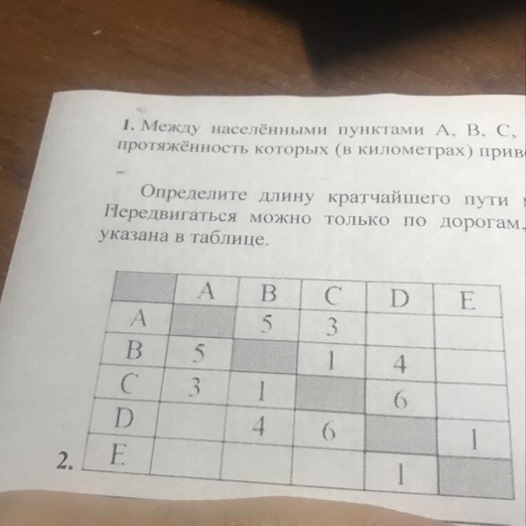 Между населенными пунктами A, B, C, D, E построены дороги, протяженность которых приведена в таблице. Определите длину кратчайшего пути между пунктами A и E. Передвигаться можно только по дорогам, протяженность которых указана в таблице.