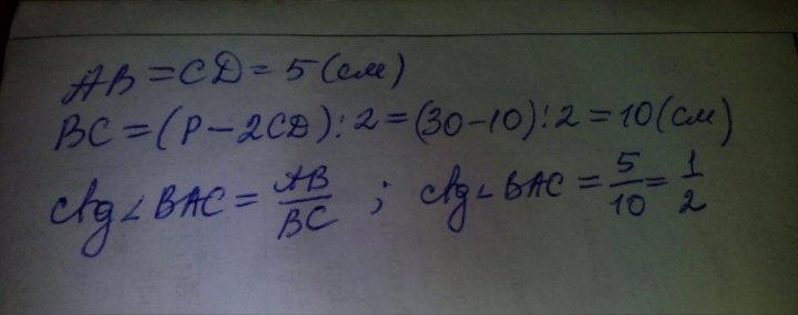 ABCD - прямоугольник с периметром 30 см. Найдите котангенс угла BОС если CD =5 см
