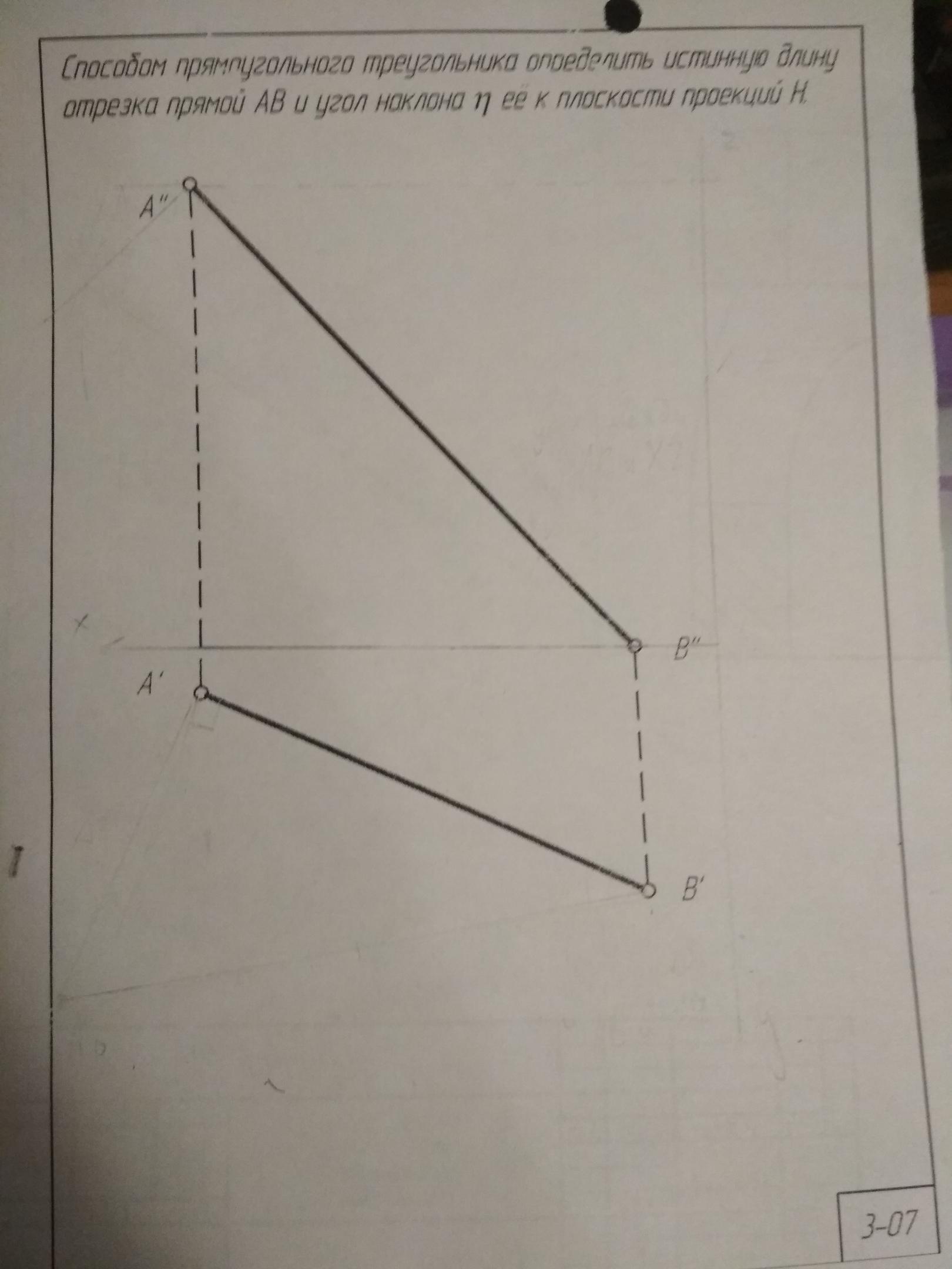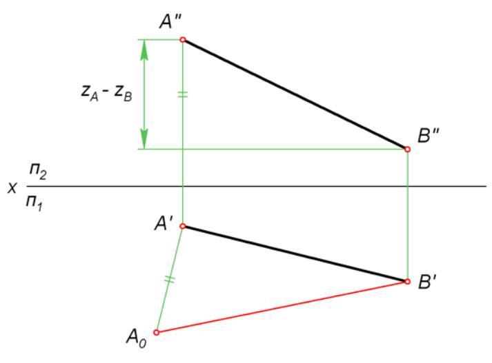 Надо на вертикальной проекции измерить разность высот между точками А и В и этот размер отложить от точки А под углом 90 градусов на горизонтальной проекции.