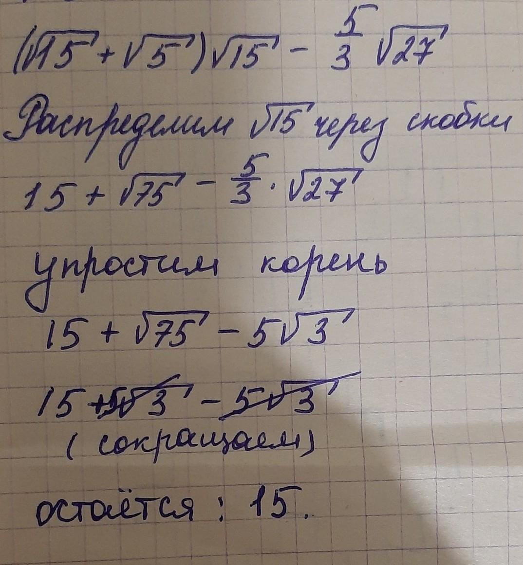 (√15 + √5) * √15 - 5/3 * √27 = (√15) * (√15) + √75 - 5/3 * √27 = 15 + √25 *√3 - 5/3 * √9 * √3 = 15 + 5√3 - 5/3 * 3√3 = 15 + 5√3 - 5√3 = 15