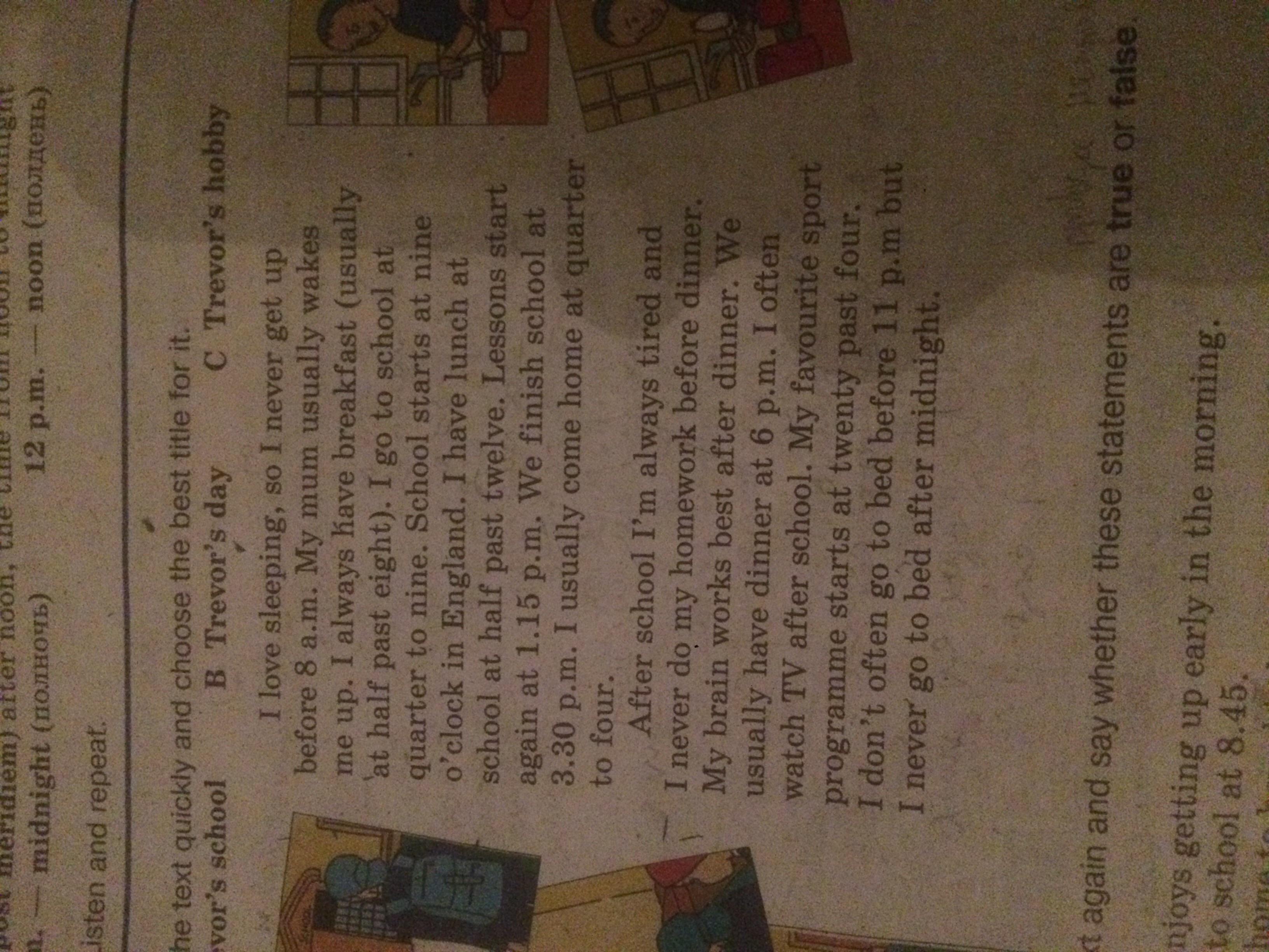 She loves sleeping, so she never gets up before 8 a.m. Her mom usually wakes her up. She always has breakfast (usually at half-past eight). She goes to school at quarter to nine. School starts at nine o'clock in England. She has lunch at school at half-past twelve. Lessons start again at 1.15 p.m. They finish school at 3.00 p.m. She usually comes home at quarter to four.