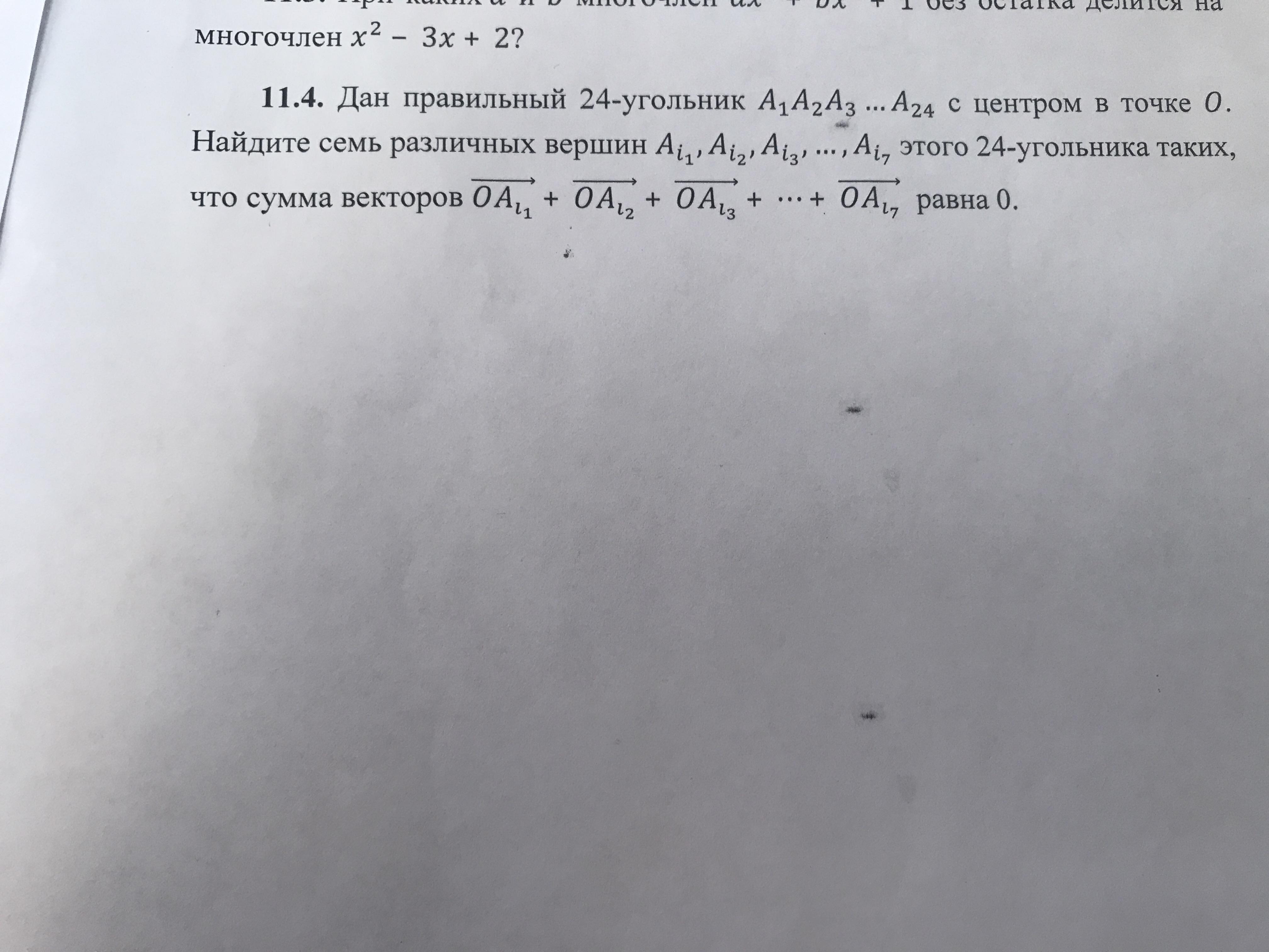 Дан правильный 24-угольник A1A2A3...A24 с центром в точке О. Найдите семь различных вершин Ai1,Ai2,Ai3,...,Ai7 этого 24-угольника таких, что сумма векторов.... смотреть фото