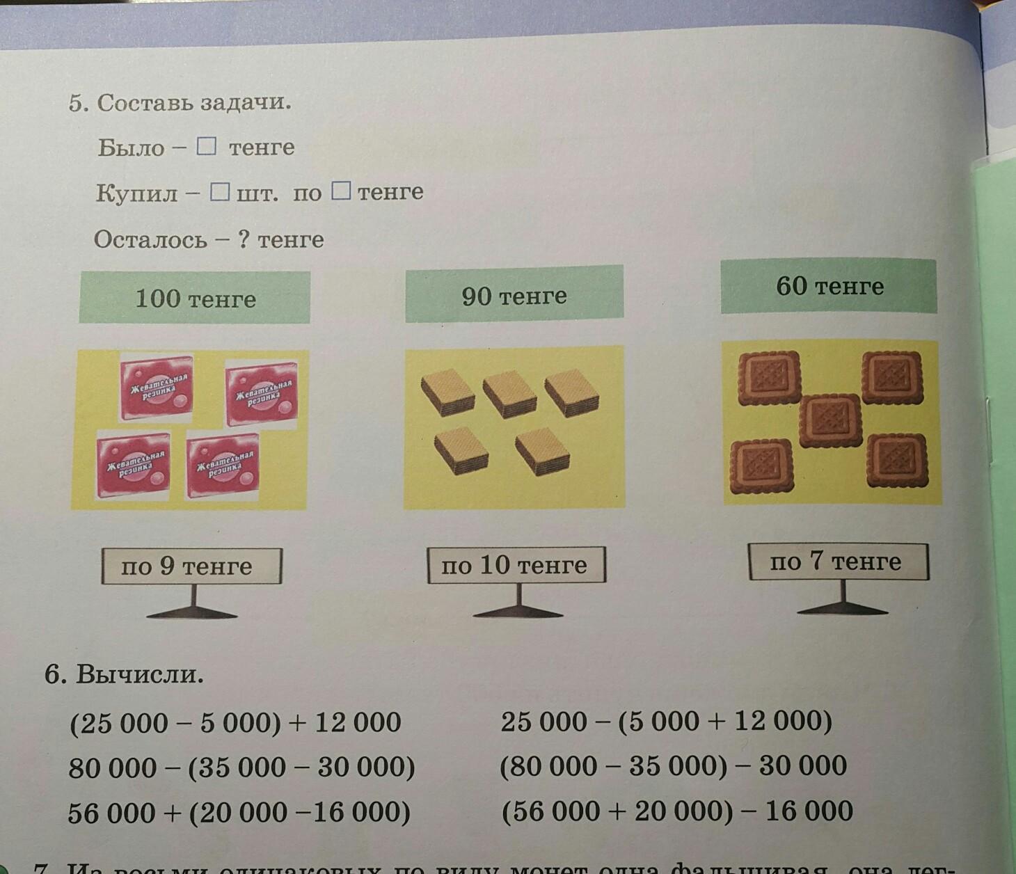 Задача 3 - Было 60 тг. Купил 5 шт по 7тг. 5×7=35 60-35=25