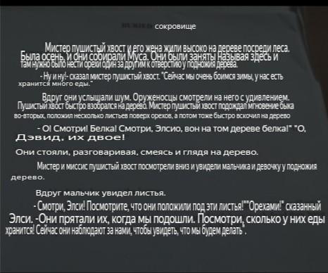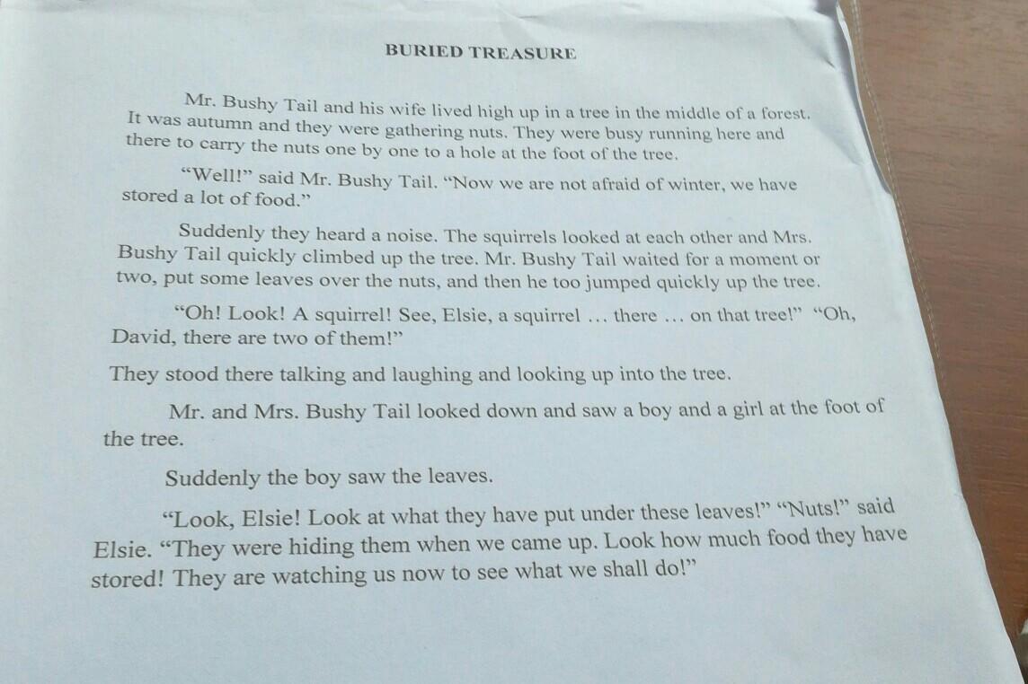 ЗАКРЫТОЕ СОКРОВИЩЕ Мистер Буши Хвост и его сын жили на дереве в лесу. Была осень, и они жадно нюхали. Они тут и там ходили, чтобы нести орехи по одному к боле у подножия дерева. "Что ж!" сказал г-н Буши Хвост: «Теперь мы не боимся зимы, у нас в Стороде много еды». Внезапно они услышали шум. Белки посмотрели друг на друга, и миссис Буши Хвост быстро взобралась на дерево. Мистер Басли Хвост подождал минуту или две, положил листья на моллюсков, а затем слишком быстро вскочил на дерево. Ой! Смотри! Белка Видишь, Элсик, белка там, Дэвид, их двое! «На том дереве!» O Они стояли там, разговаривали, смеялись и смотрели на дерево. Мистер и миссис Буши Хвост посмотрели вниз и увидели мальчика и девочку у подножия дерева. Внезапно мальчик увидел листья. «Посмотри, Элси! Посмотри, что они положили под эти листья!» Орехи! - сказала Элси. - Они прятали их, когда мы подошли. Посмотрите, сколько еды они хранят! Они смотрят на нас сейчас, чтобы увидеть, что мы будем делать! »3AKPbITb