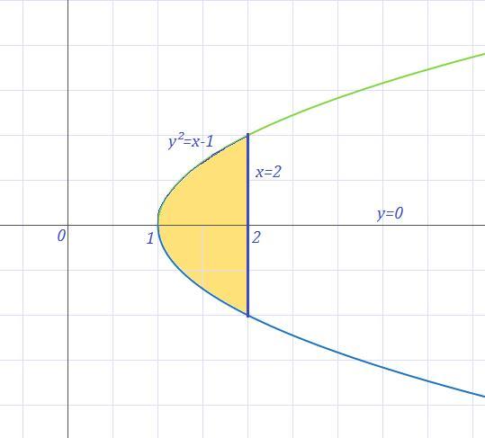 Выразим х через у из формулы линии y²-x+1=0; у²(х)=(х-1); х= y²+1 Если у=0, то х=1, если же х-2=0, то х=2, пределы интегрирования 1 и 2.