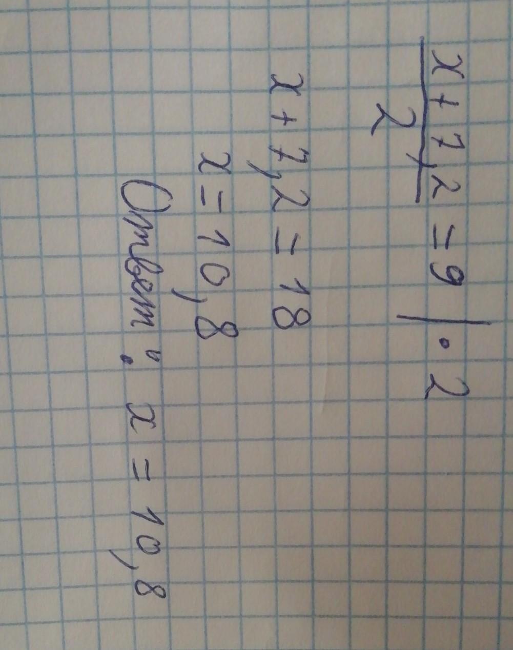 (X + 7.2) / 2 = 9, => x + 7.2 = 18 => x = 10.8