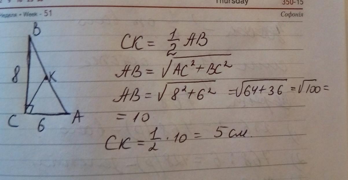 AC=6; BC=8. Найдите медиану CK этого треугольника
