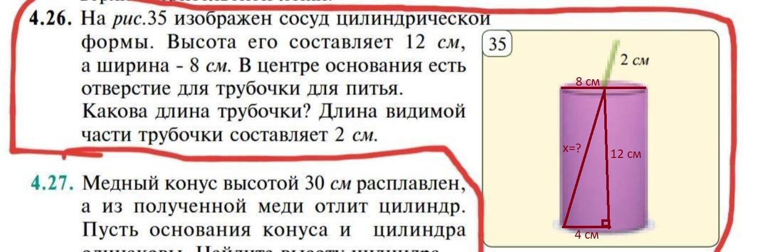 Общая длина трубочки для питья составляет 4√10 + 2 см ≈ 4*3,16 +2 см = 14,64 см.