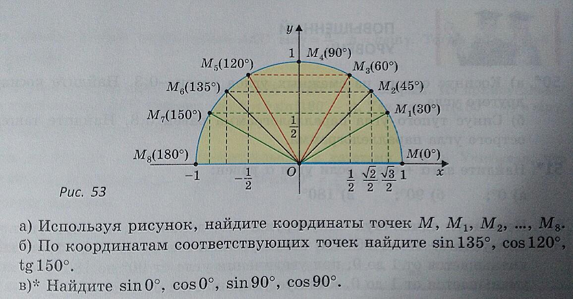 в) sin0° = 0, cos0° = 1, sin90° = 1, cos90° = 0