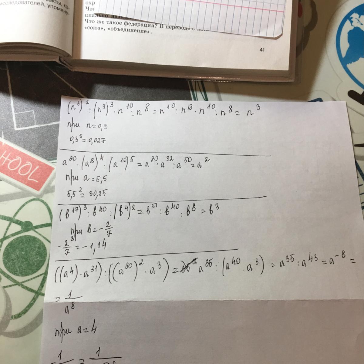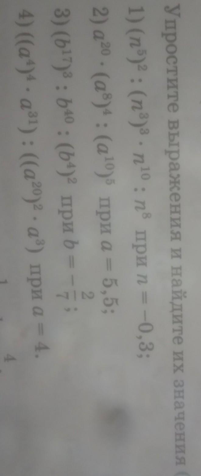 Ответ:1=-0.3 в 3 степени, 2=5.5 в 2 степени, 3=минус две седьмые в 3 степени, 4=4 в 366 степени.