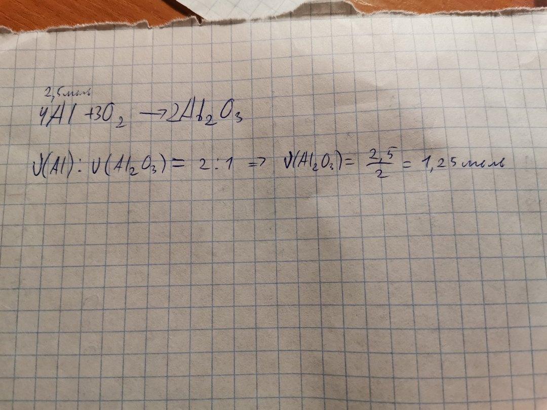 реши задачу. вычисли количество вещества оксида алюминия который образует при сжигания в кислороде алюминия количеством вещества 2,5 моль