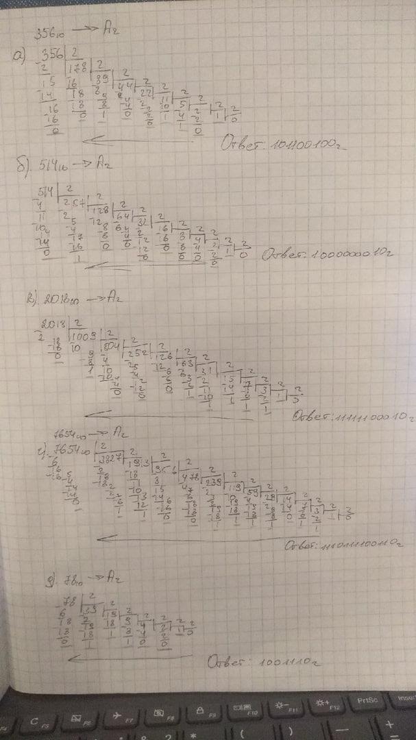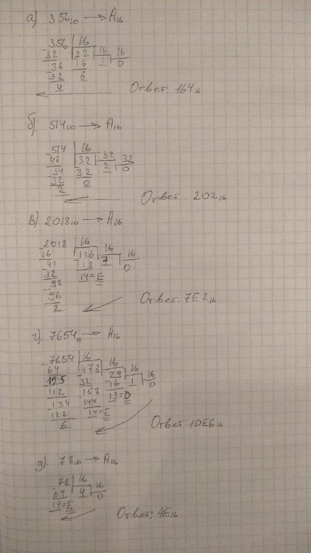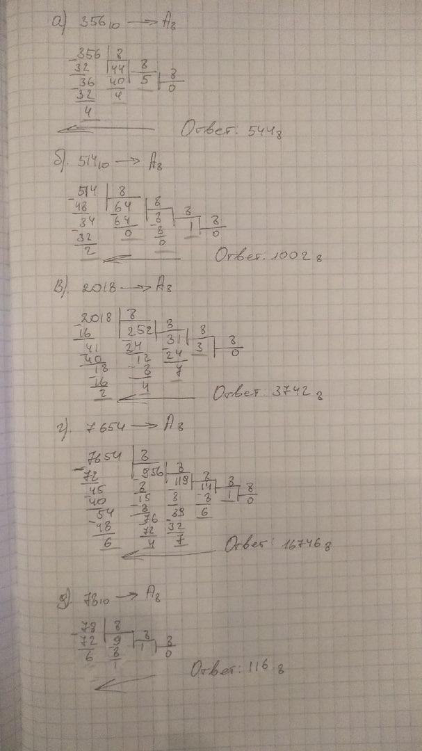 Перевести целые числа из десятичной системы счисления в двоичную, восьмеричную и шестнадцатеричную системы: а) 356; б) 514; в) 2018; г) 7654; д) 78. Показать полное решение.