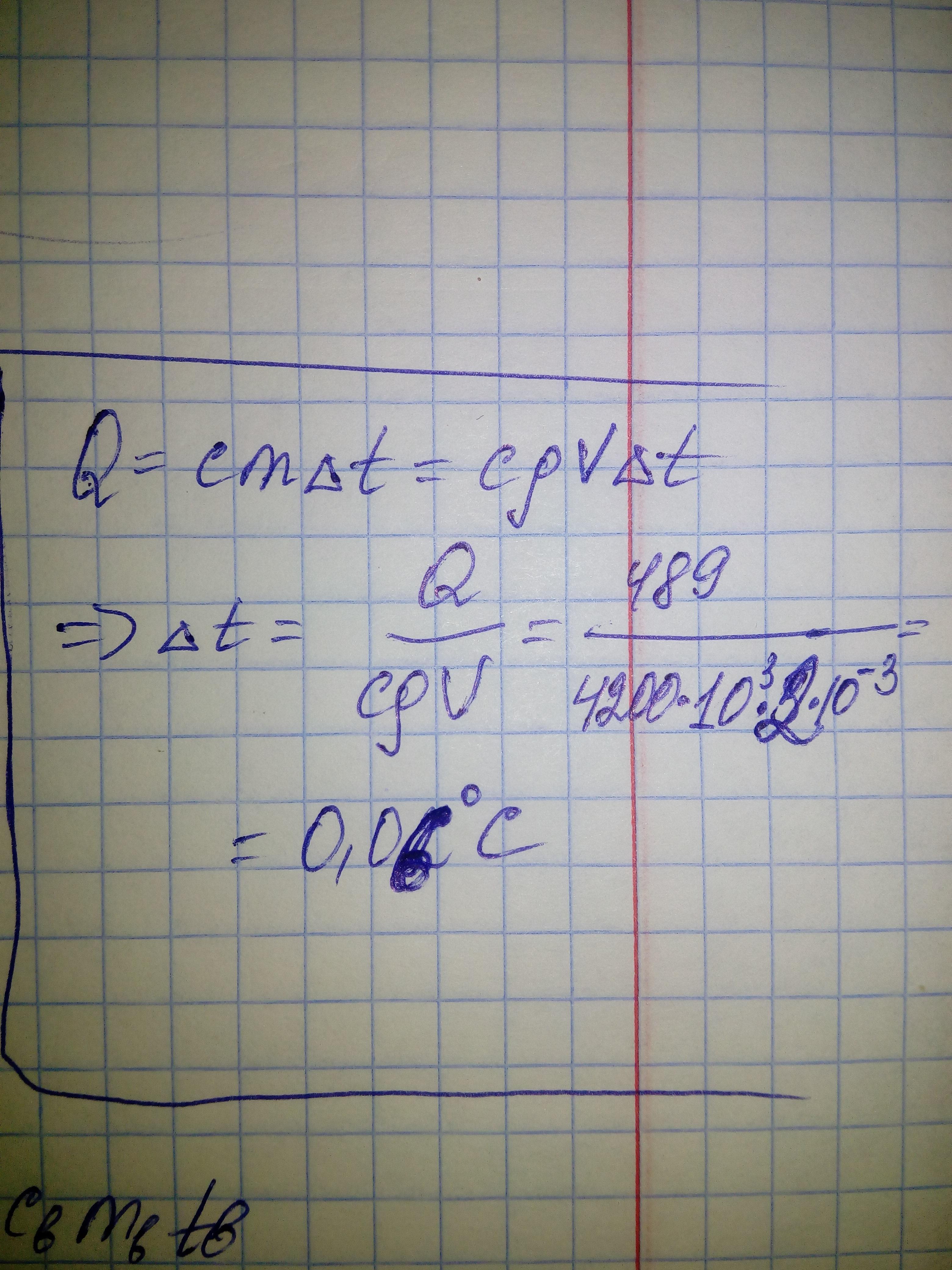 Δt=489/4 200*2*10^-3*1 000=0,058 °C
