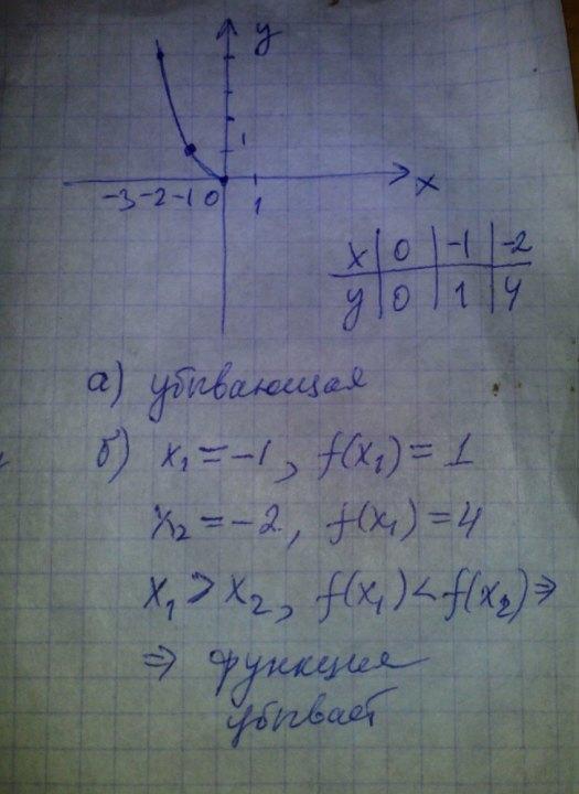 Построить график функции y=x^2 на промежутке [0;+бесконечность) а) возрастающей или убывающей является данная функция на этом промежутке? б) с помощью определения докажите своё утверждение в пункте,, а"