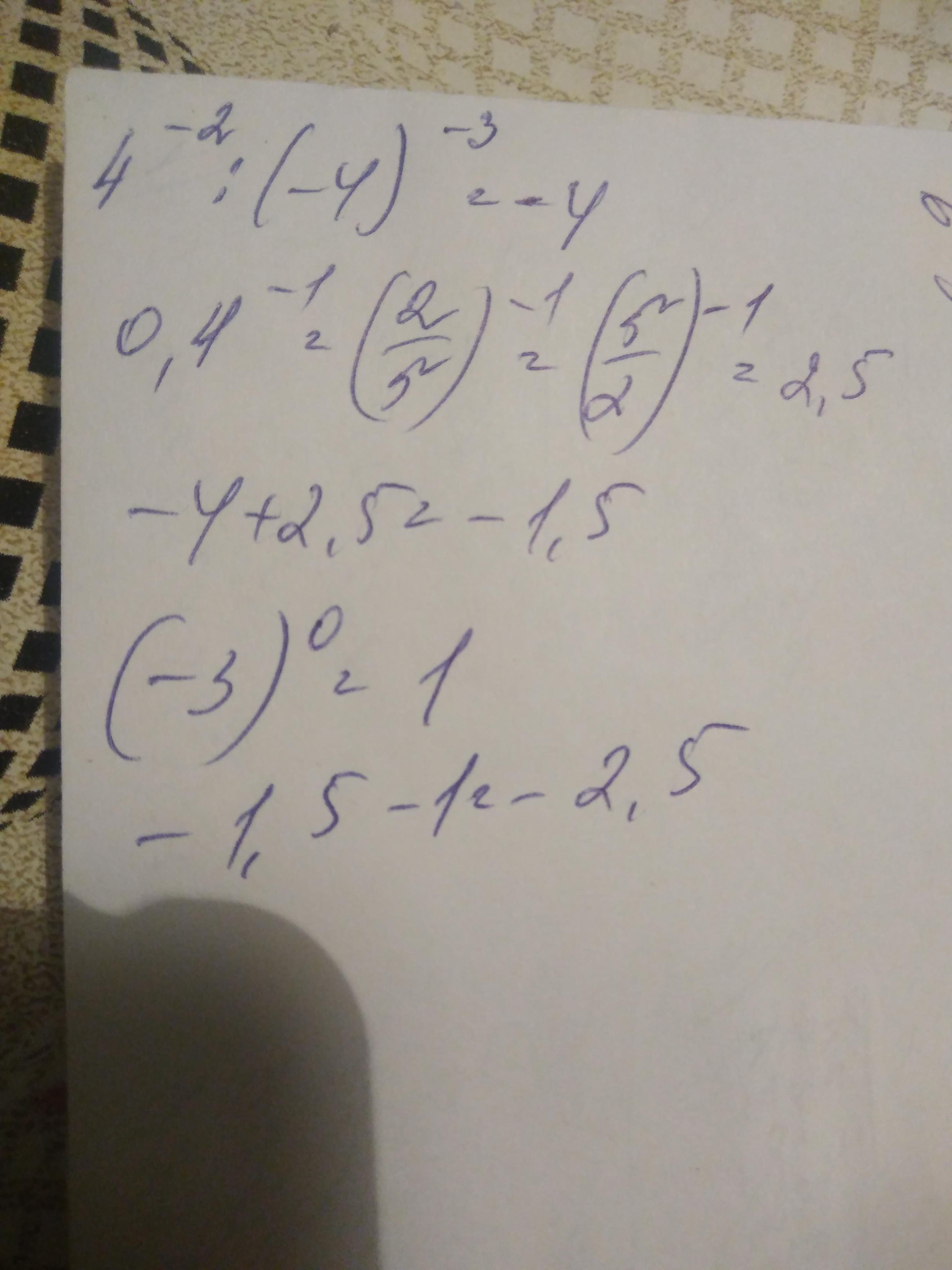 4^-2 : (-4)^-3 + 0,4^-1 -(-3)^0=4^-2:(-4^-3)+(2/5)^-1 -1=-4+5/2-1=-5+5/2=-2,5