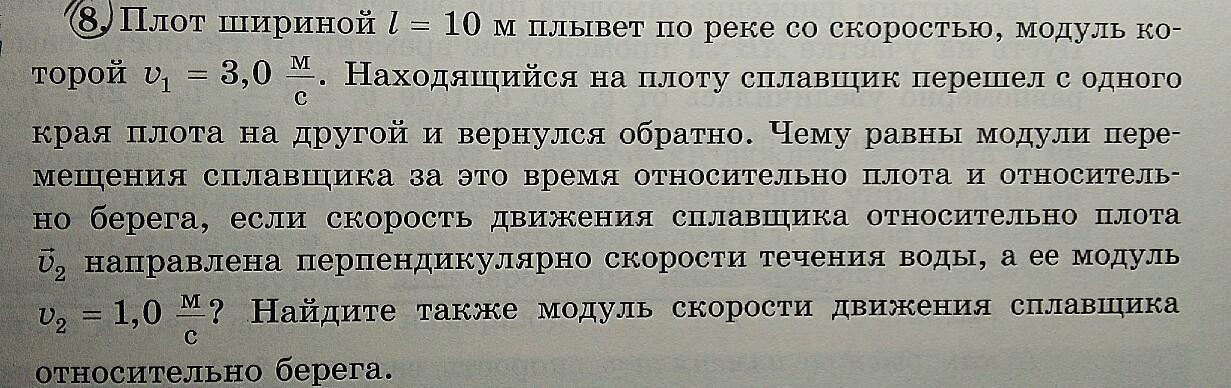 По реке плывет плот шириной 10 м со скоростью 1 м/с. По плоту перпендикулярно течению реки идет человек. За 20 с он проходит от одного края плота до другого и обратно. Найти скорость, перемещение и пройденный путь относительно плота и относительно берега.