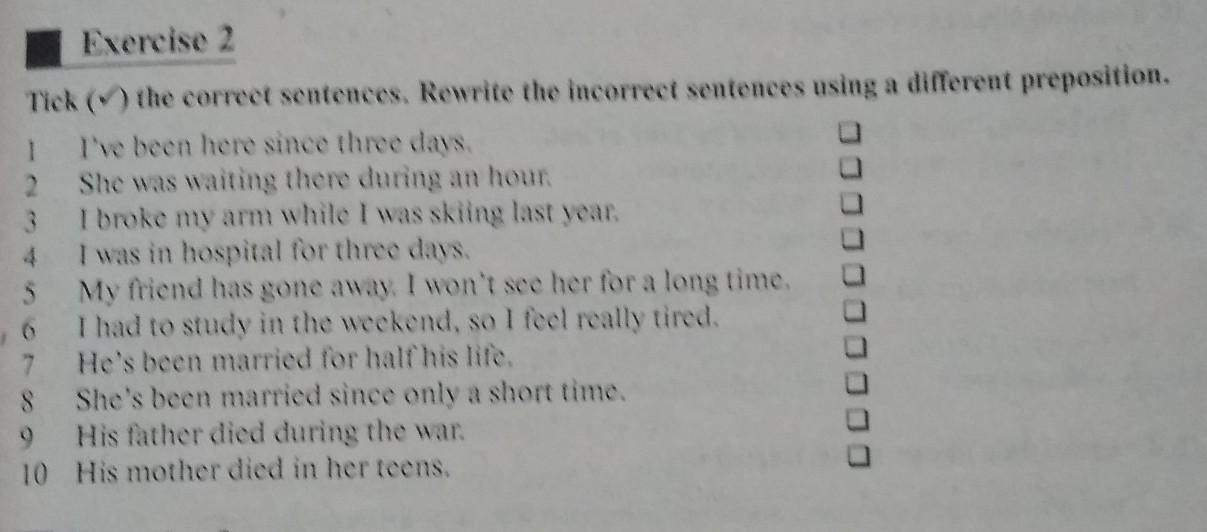 Tick (v ) the correct sentences. Rewrite the incorrect sentences using a different preposition.