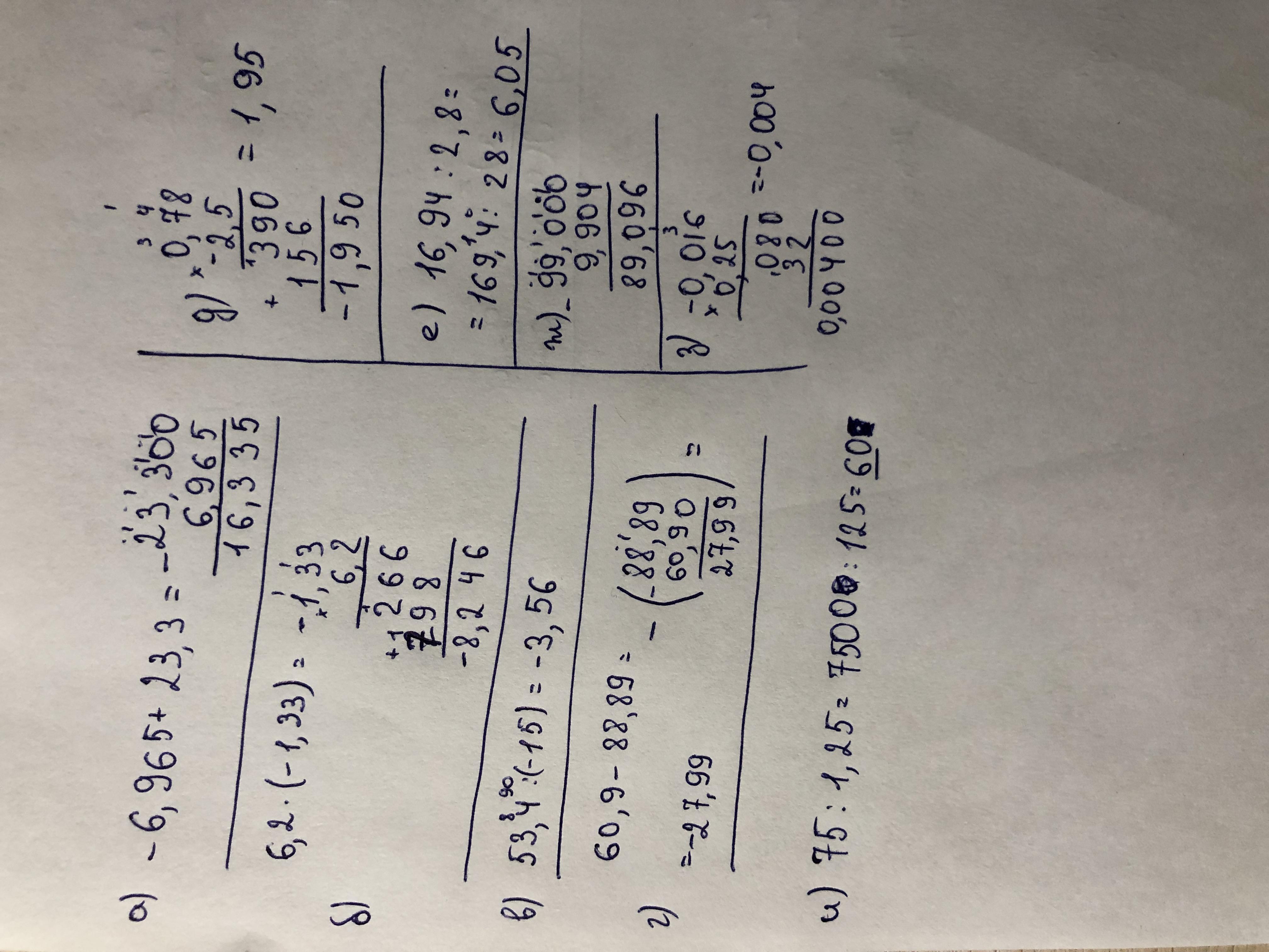 г) 60,9 – 88,89; д) 0,78 ∙ (–2,5); e) –16,94 : 2,8;